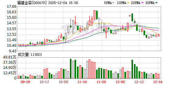 证券时报·数据宝统计,截至发稿,福建金森收盘价为12.55元,上涨2.45%,本期筹码集中以来股价累计下跌14.10%。具体到各交易日,5次上涨,5次下跌,其中,跌停1次。